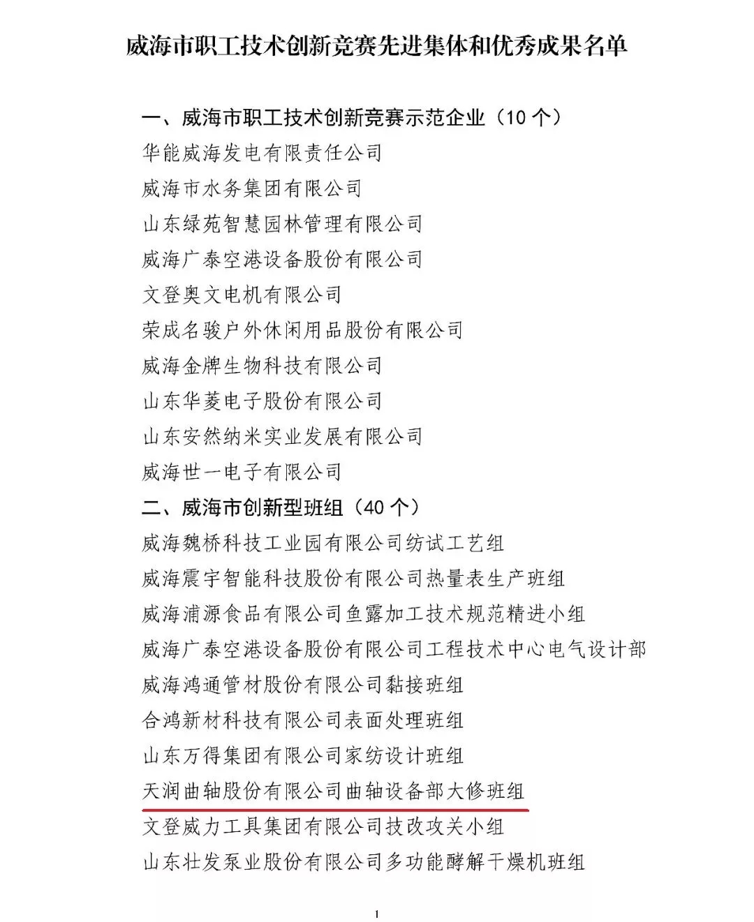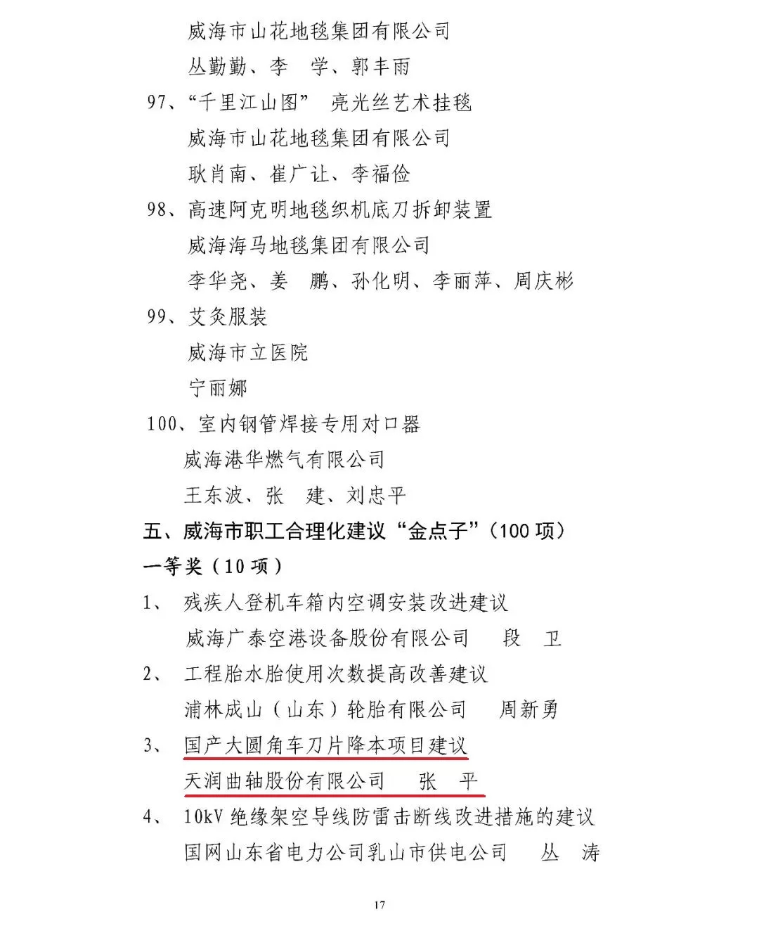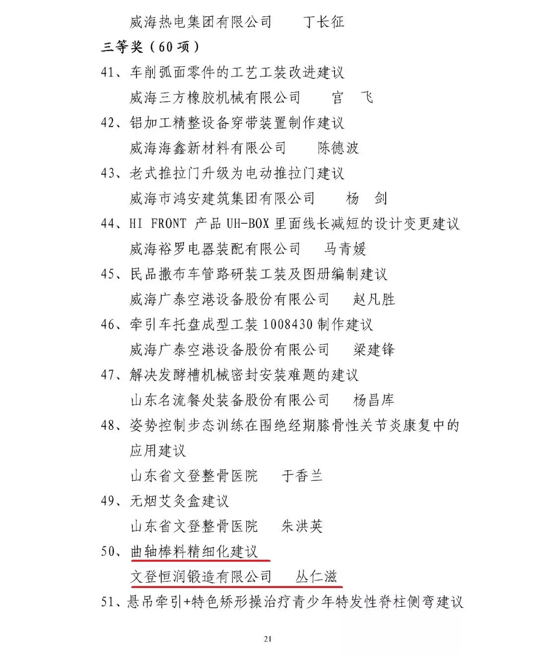 ÎĵǺãÈóÖýÔìÓÐÏÞ¹«Ë¾´ÔÈÊ×Ì¡°ÇúÖá°ôÁÏϸÄ廯½¨Ò顱»ñÍþº£ÊÐÖ°¹¤ºÏÀí»¯½¨Òé¡®½ðµã×Ó¡¯¡±ÈýµÈ½±¡£