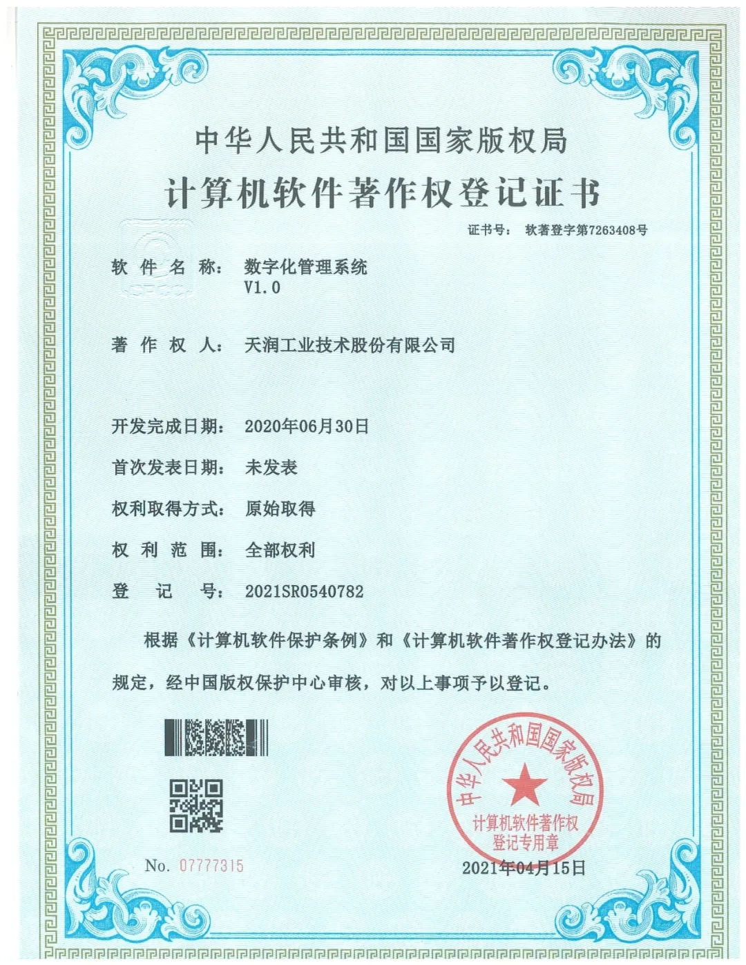 ¿ËÈÕ£¬ÓÉÎÒ¹«Ë¾ÆóÒµÖÎÀí²¿ÐÅÏ¢ÖÐÐÄ×ÔÖ÷Ñз¢µÄÊý×Ö»¯ÖÎÀíϵͳ,»ñµÃ¹ú¼Ò°æÈ¨¾ÖÈÏÖ¤µÄÅÌËã»úÈí¼þÖø×÷Ȩ¹ÒºÅÖ¤Êé,±ê¼Ç×ÅÎÒ¹«Ë¾µÄÊý×Ö»¯ÖÎÀíϵͳӵÓÐ×ÔÁ¦µÄ×ÔÖ÷֪ʶ²úȨ£¬¹«Ë¾Öǻ۹¤³§Êý×Ö»¯½¨ÉèÈ¡µÃÖØ´óÍ»ÆÆ,¾ßÓÐÀï³Ì±®µÄÒâÒå¡£